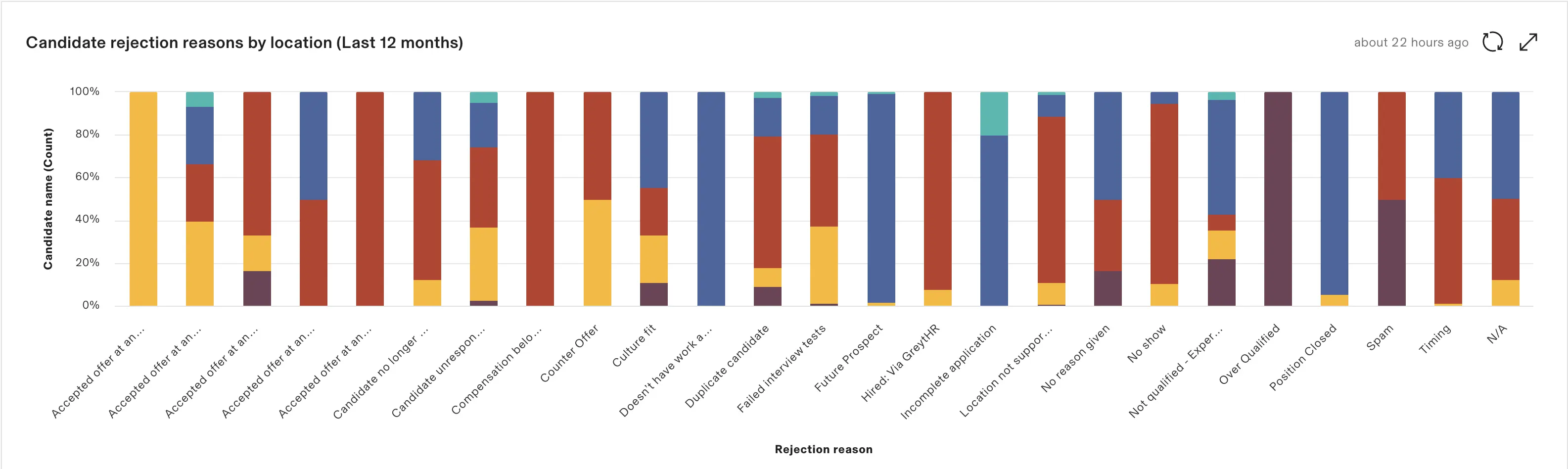 The reports also help us understand rejection trends by source. We can break rejections down by location or by agency and start to see patterns. For example, if a certain agency's candidates keep getting rejected for technical skill, or if applicants from one job requisition location rarely pass the culture fit screen. That kind of insight makes it easier to adjust our sourcing strategy and have more informed conversations with recruiters.
